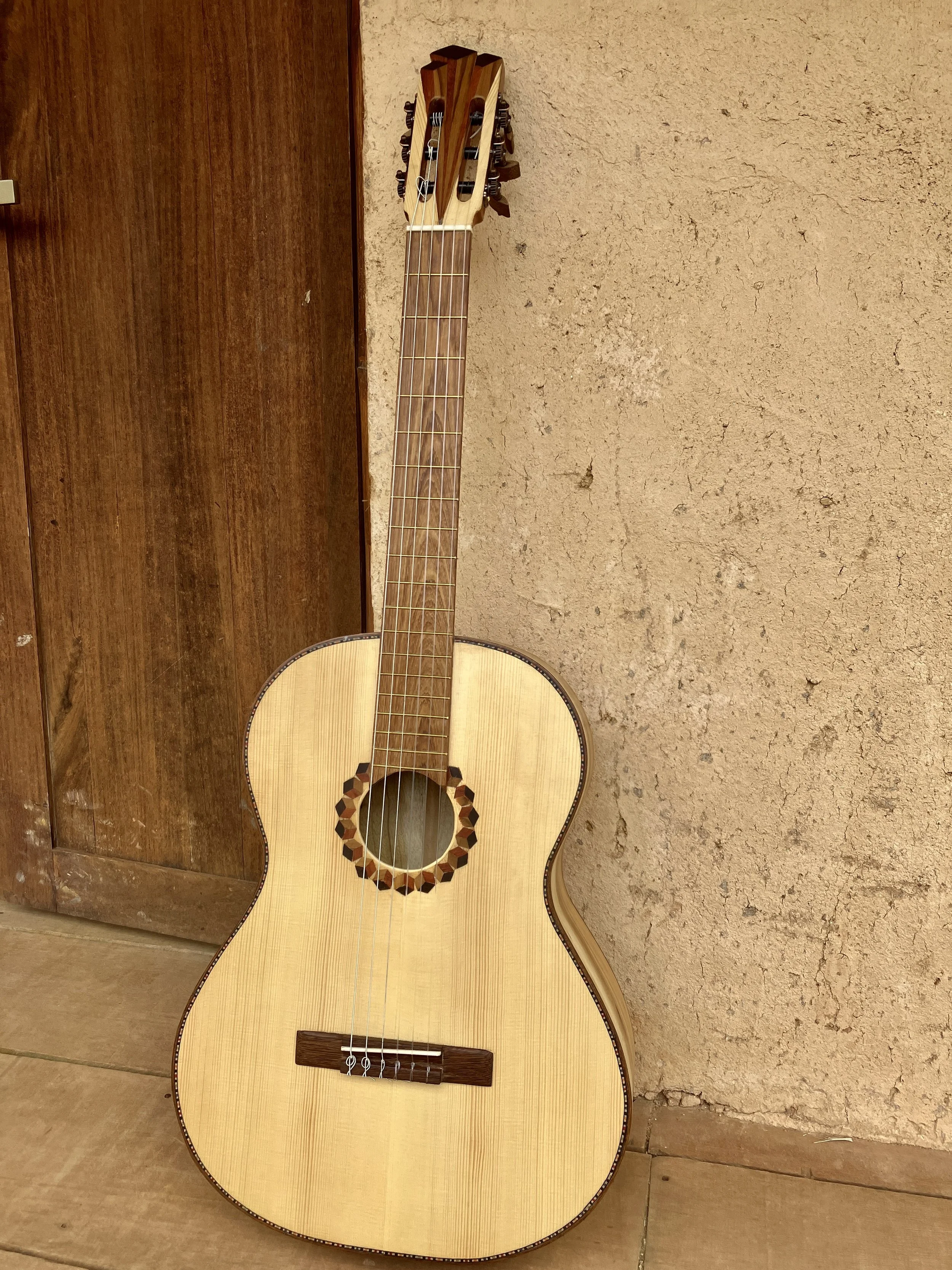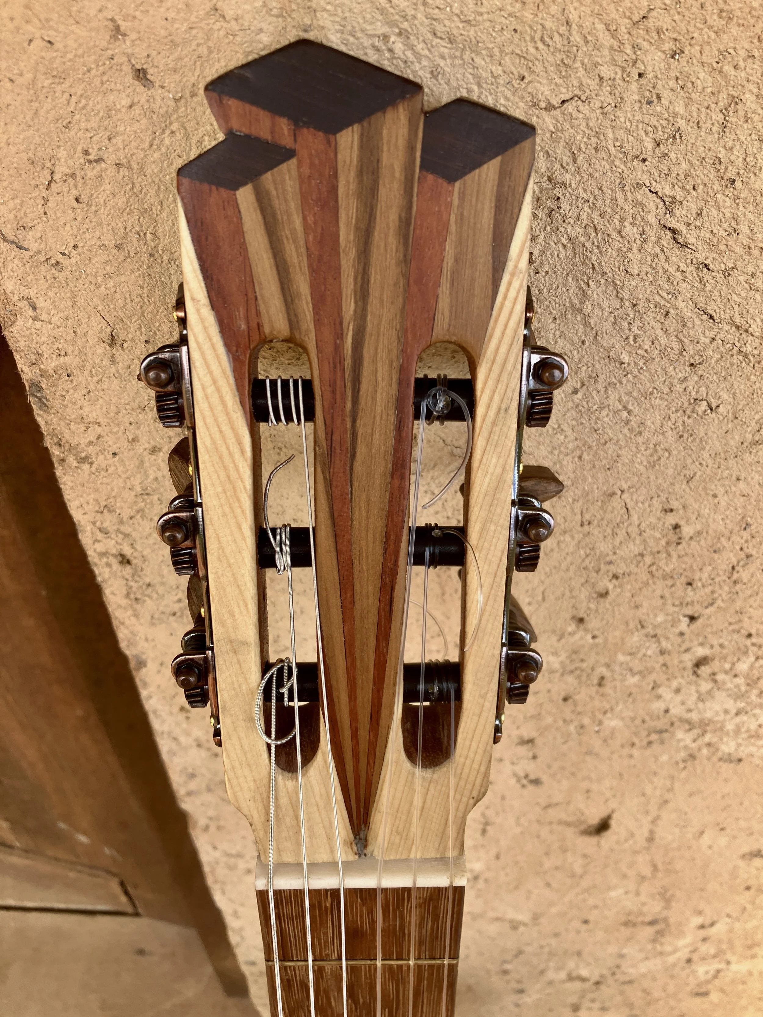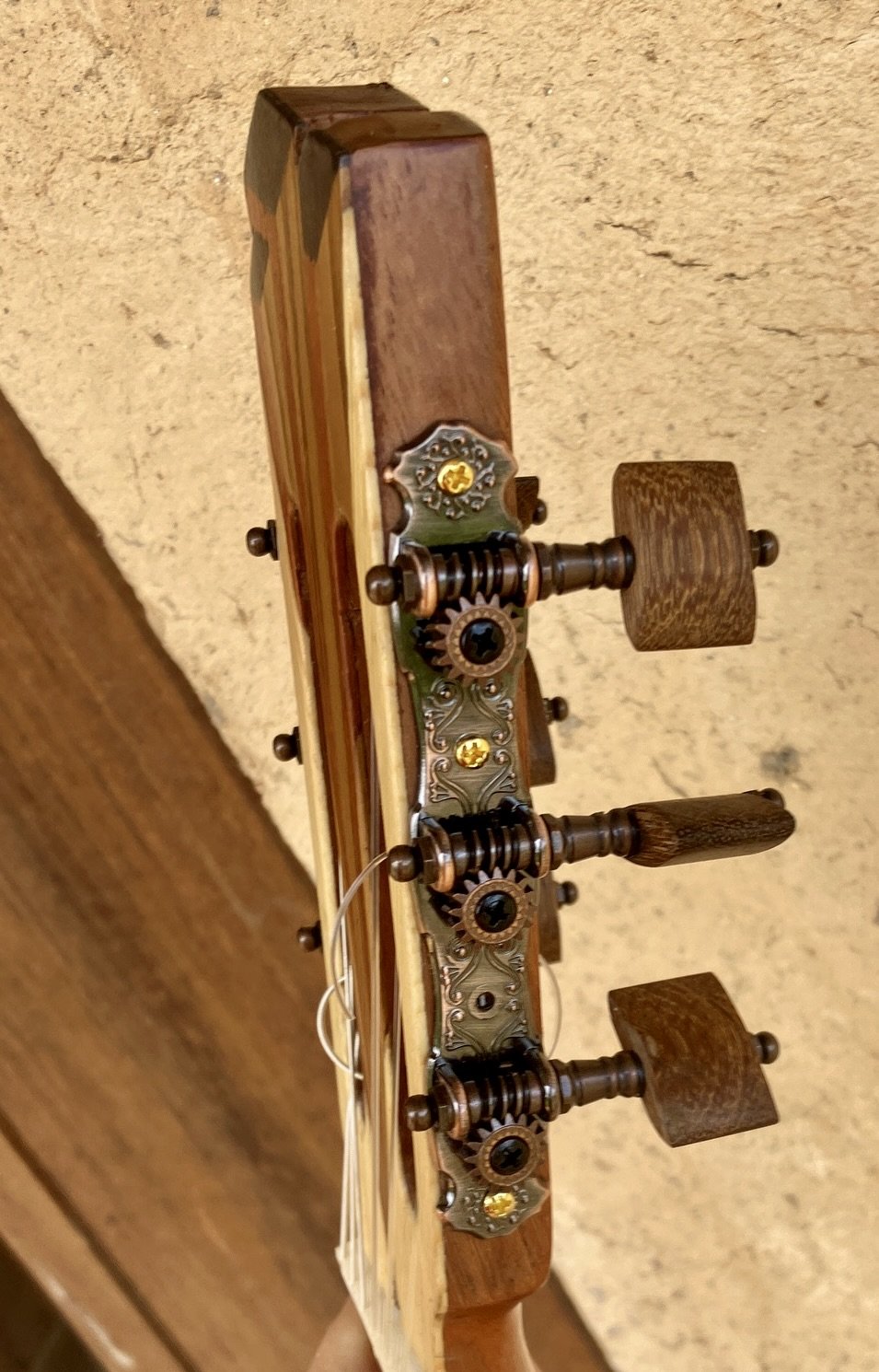 The fretboard, bridge, and key details are made from Sapan (Alma Negra)—a dense, dark hardwood that’s both durable and understated. Inlays in Cocobolo, Ebony, Nazareno, and Teak offer subtle contrast without drawing attention away from the wood itself. Each tuning key was hand-carved to fit the guitar’s tone and feel.
